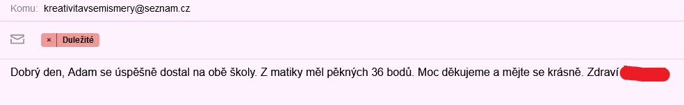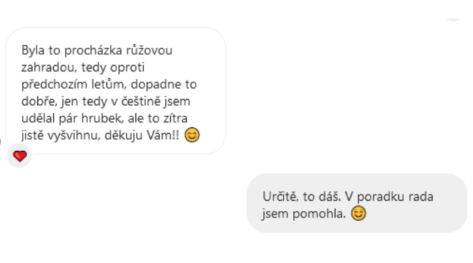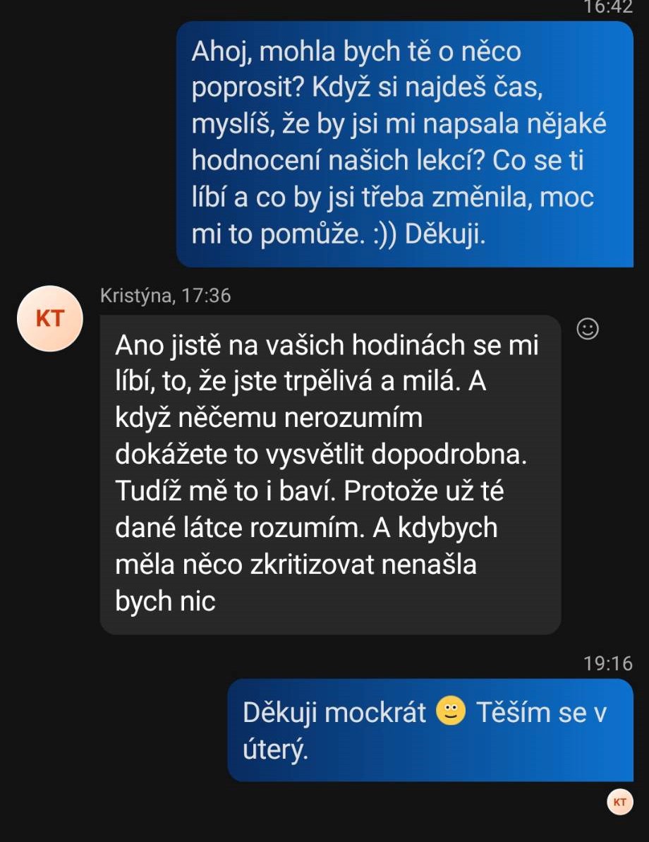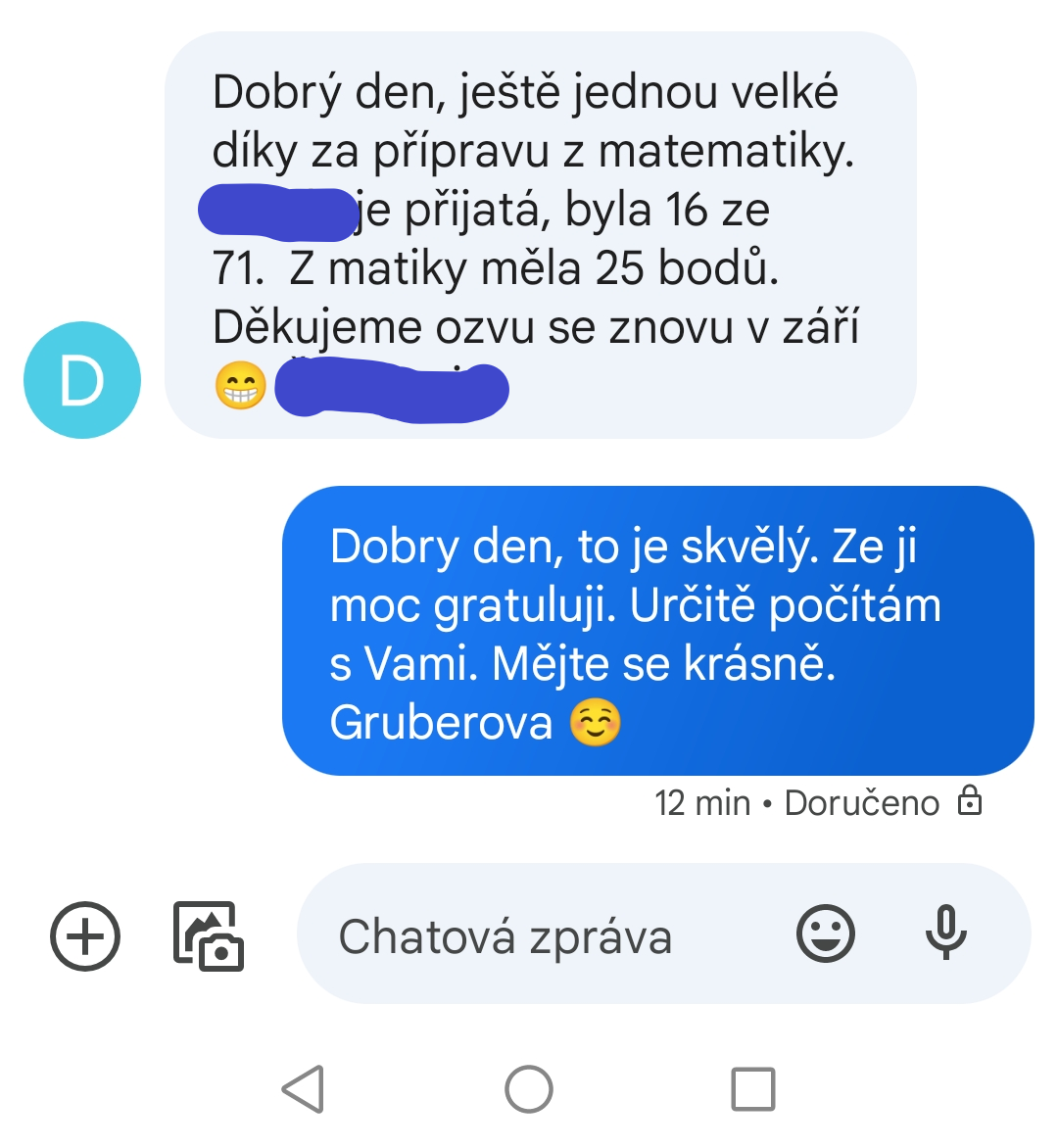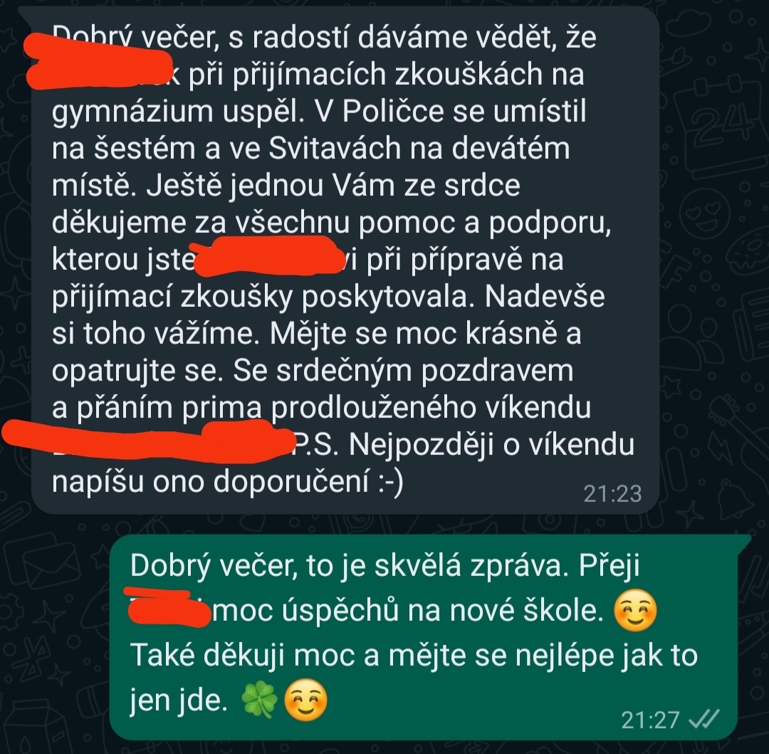 Doučování na přijímací zkoušky bylo fajn hlavně díky individuálnímu přístupu, byla vysvětlena látka, ve které byly mezery. Vždy skvělá komunikace. Moc děkujeme.