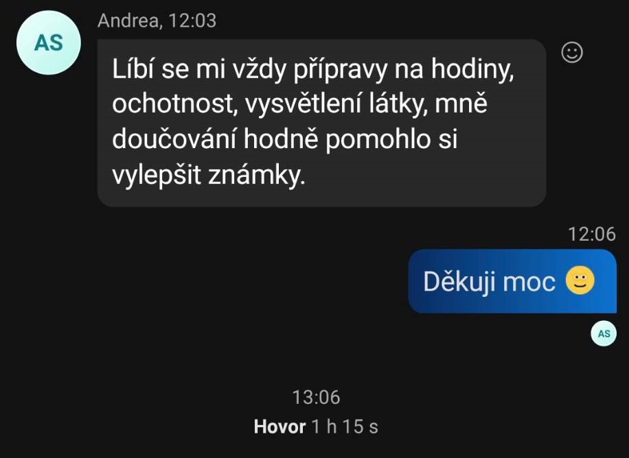 Výuka byla vždy srozumitelná, trpělivá a přizpůsobená individuálním potřebám. Oceňuji profesionální přístup, dochvilnost a schopnost vysvětlit i složitější látku jednoduše a přehledně. Díky doučování se výrazně zlepšily nejen známky, ale i celkové porozumění matematice. Určitě doporučuji!