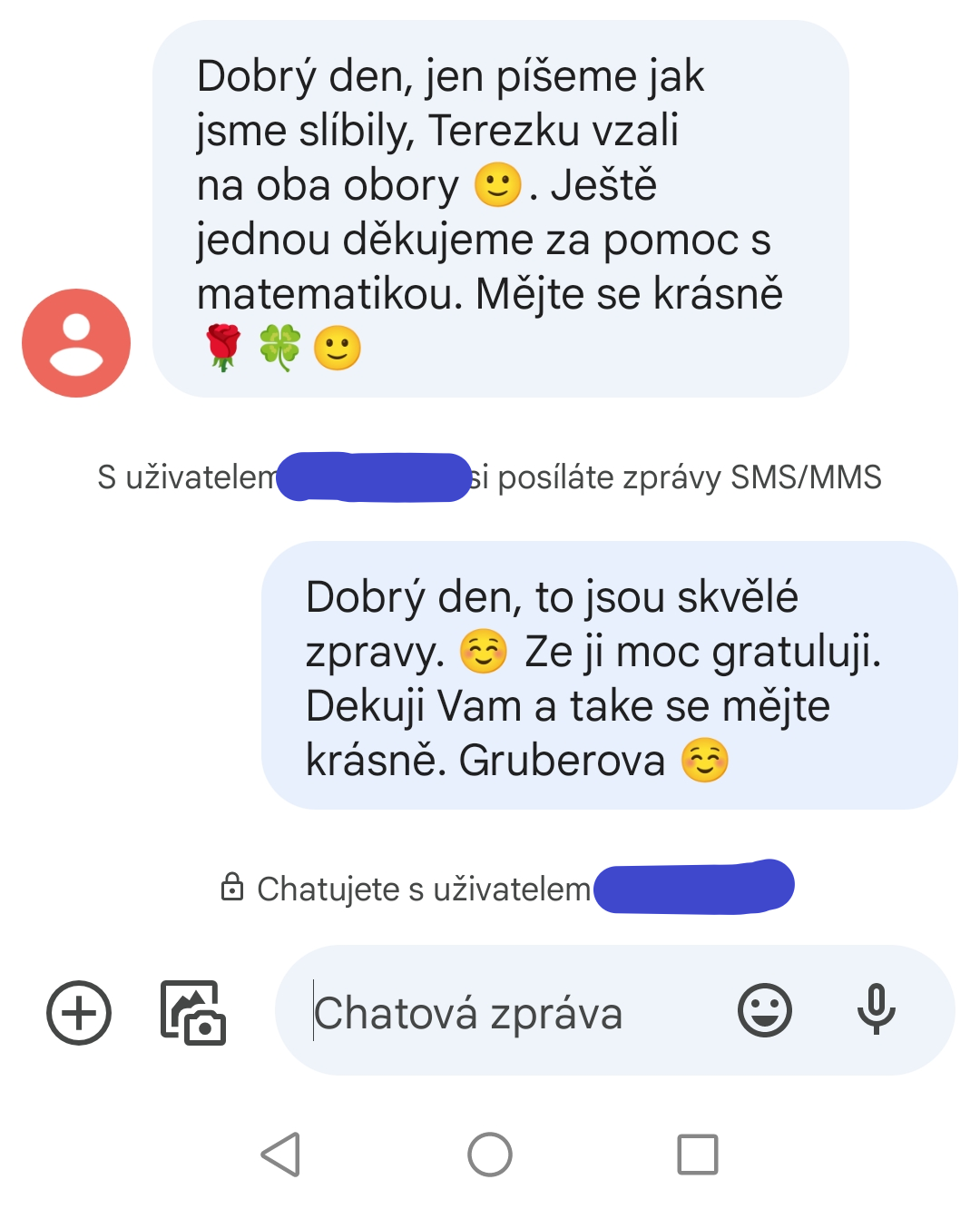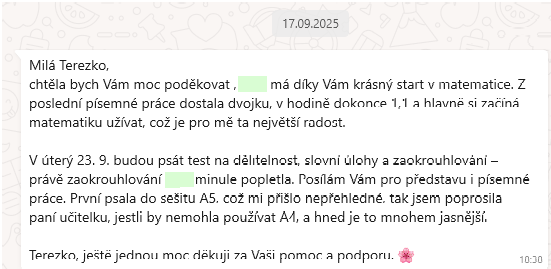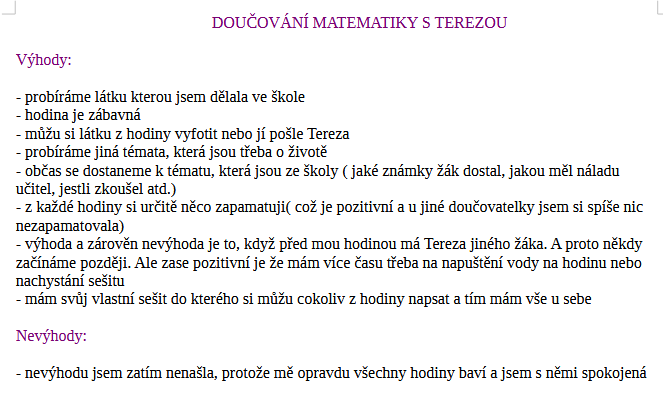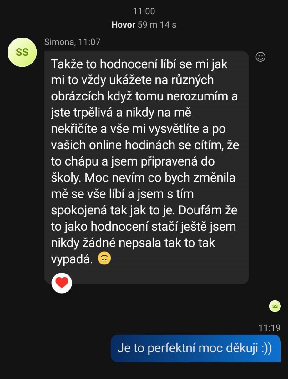 Děkujeme za perfektní doučování. Dcera měla celou základní školu úlevy ve vyučování pro dysfazii, matematika ji vůbec nešla. Ještě vloni jsme mysleli, že se bude hlásit na učiliště. Nakonec dala přihlášky na střední školu a s Terezou perfektně zvládla přípravu a na střední školu se dostala. Oceňujeme milý, trpělivý přístup. Byla ochotná poradit vždy, když dcera něco nevěděla i mimo lekce. Přes whats up to spolu vyřešily. Můžeme jen doporučit.