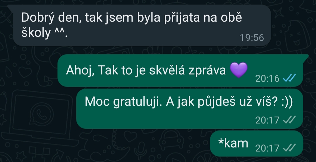Moc moc doporučuji. Letos jsem dělala přijímačky a bez přípravy se slečnou Terezou bych to nezvládla. Všechnu látku, ve které jsem měla mezery mi výborně vysvětlila a hlavně jednoduše. Lekce jsem měla 2x týdne a na každou jsem se upřímně těšila a věděla jsem, že mi to opravdu pomáhá. Lekce probíhají v klidu, když jsem něco hned nevěděla, tak to vůbec nevadilo a bylo mi vše vysvětleno. Na lekce jsem si mohla připravovat i různé příklady sama, které jsem dělala mimo lekce a nevěděla jsem, jak na ně. Samozřejmě jinak má slečna Tereza vše připravené ona. Určitě vřele doporučuji nejen na přijímací zkoušky. Mockrát děkuji.